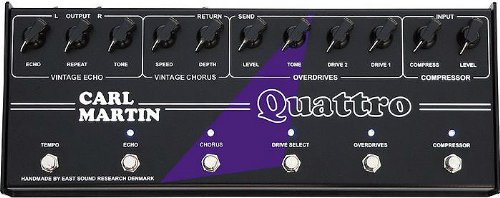 The Carl Martin Quattro Guitar Multi Effects Pedal begins with Carl Martin's award winning compressor/limiter circuit with single controls for compression and level. The 2-channel overdrive has switches for on-off, and for selecting between the crunch and high-gain stages, and controls for tone and level. In classic fashion, the tremolo has speed and a depth control. Finally, the vintage style echo has controls for level, tone, repeat and tap-tempo, as well as an on-off switch. No hard to read screens, no menus to scroll through, just set-up and play. One of the simplest multi-effects on the market! There is also an effects loop built in between the overdrive and tremolo effects for that special drive or fuzz pedal that is part of your sound.CHECK PRICE NOW! GET DISCOUNT PRICE ON SALE